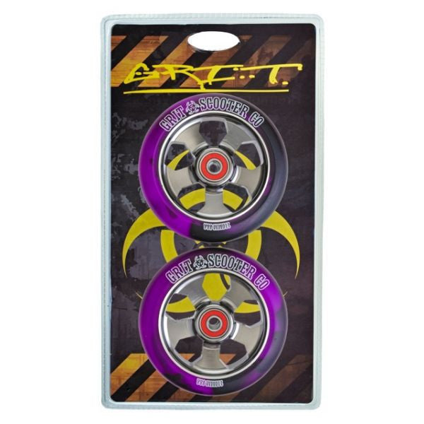 Grit 110mm metal core wheels have always been popular with pro scooters. With the Grit 110mm Wheels 2 Pack, you get two Grit 110mm metal cores for one low price. The two tone wheel color is like nothing seen on a scooter wheel before. So if you’re down with 110mm wheels and sick two tone colors, check these out!